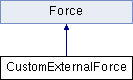 To use this class, create a CustomExternalForce object, passing an algebraic expression to the constructor that defines the potential energy of each affected particle. The expression may depend on the particle's x, y, and z coordinates, as well as on any parameters you choose. Then call addPerParticleParameter() to define per-particle parameters, and addGlobalParameter() to define global parameters. The values of per-particle parameters are specified as part of the system definition, while values of global parameters may be modified during a simulation by calling Context::setParameter(). Finally, call addParticle() once for each particle that should be affected by the force. After a particle has been added, you can modify its parameters by calling setParticleParameters(). This will have no effect on Contexts that already exist unless you call updateParametersInContext().